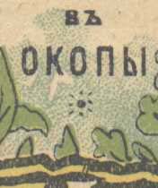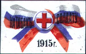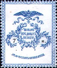 1914 г. Разм. 32 х 39 мм. Одноцветная печать на бумаге различных цветов. Зубц. 11 1/2 и Б.З. Сверху орел с георгиевским крестом, ниже венок, в центре которого текст в три строки: «Воинам передовых позиций». Ниже полукругом текст: «От Общества Русских Антиквариев». Без номинала.