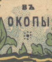 1915 г. 23.-26.06.1915 г. Разм. 51 х 75 мм. Одноцветная печать на зеле-но-серой бумаге. В центре в декоративной рамке разм. 40 х 50 мм текст в пять строк: «На респираторы-противогазы «Китай Город нашим воинам героям»». Внизу под рамкой текст в две строки: «Комитет Рос[сийского]. О-ва Кр[асного]. Кр[еста]. Торгов[цев]. и Служащих Верх[них]. Торгов[ых]. Рядов».