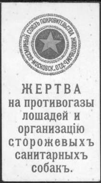 1915 г. 05.-06.07.1915 г. Разм. 34 х 48 мм. Одноцветная печать на толстой белой бумаге. В центре солдат в противогазной маске. Сверху текст: «На противогазы». Выше кружок для отметки места пробивки отверстия. Внизу дата: «5 и 6 /VII 1915 г.». Слева внизу мелкими буквами инициалы художника: «А.К.».