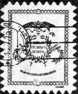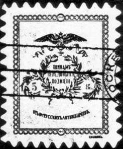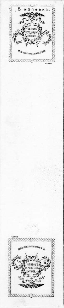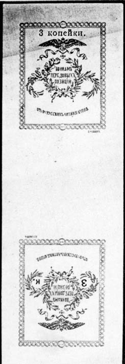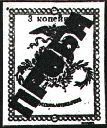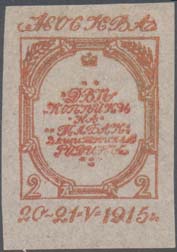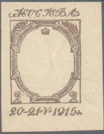 1914 г. Разм. 32 х 39 мм. Одноцветная печать на белой бумаге. Зубц. 11 1/2 и Б.З. Орел с георгиев-ским крестом, ниже венок, в центре которого текст в три строки: «Воинам передовых позиций». Ниже полукругом текст: «От Общества Русских Антиквариев». Номинал над орлом. Тип I – высота цифр номинала 2,5 мм. Тип II – высота цифр номинала 2 мм.