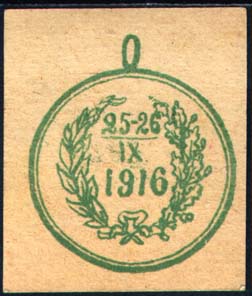 1916 г. 25.-26.09.1916 г. Разм. 40 х 47 мм. Одноцветная двухсторонняя печать на толстой желтоватой бумаге. Лицевая сторона аналогична предыдущему выпуску. На оборотной стороне в центре круглая медаль диаметром 33 мм с ушком. В венке их дубовых и лавровых листьев дата: «25-26.09.1916».