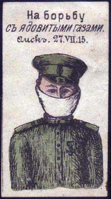 1915 г. 27.07.1915 г. Разм. 37 х 67 мм. Трехцветная печать на белой бумаге. В центре солдат в противогазной маске. Сверху текст в три строки: «На борьбу с ядо-витыми газами. Омск. 27.VII.15.».