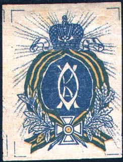 1915(?) г. Разм. 40 х 52 мм. Трехцветная печать на желтоватой бумаге. В центре в обрамлении георгиевской ленты и венка монограмма «О.К.». Внизу георгиевский крест, сверху императорская корона.