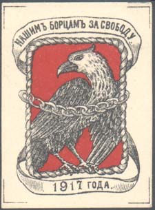 1917 г. Разм. 37 х 50 мм. Двухцветная печать на плотной белой бумаге. В центре орел в рамке, с натянутой поперечно цепью. Сверху на ленте текст: «Нашим борцам за свободу». Внизу на ленте продолжение текста: «1917 года».