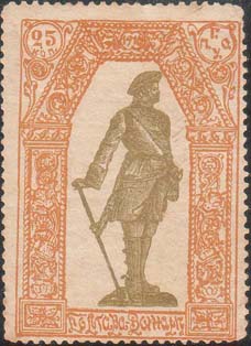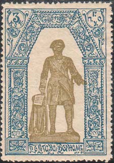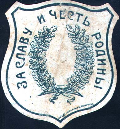 1917(?) г. Виньетка в виде щитка сложной формы разм. 63 х 71 мм. Одноцветная печать на тонкой белой бумаге. В фигурной рамке, повторяющей контуры щитка в центре венок из двух дубовых веток. По окружности текст: «За славу и честь Родины». Слева внизу с внутренней стороны рамки мелким шрифтом выходные данные: «Лит. Дзакова и Кмата, Пятигорск».