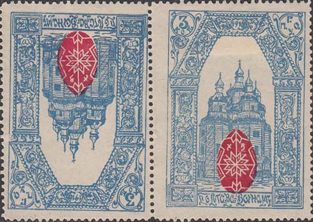 1915(?) г. Виньетка в виде овала разм. 62 х 52 мм. Одноцветная печать на желтоватой бумаге. В центре блюдо на фоне скрещенных веток вербы. На блюде крашенные пасхальные яйца, пасха и кулич. Сверху и снизу полукругом текст: «На пасхальные подарки воинам». Справа внизу мелким шрифтом выходные данные: «Лит. Дзакова и Кмата, Пятигорск».