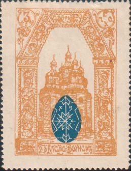 1915(?) г. Разм. 32 х 53 мм. Одноцветная печать на белой бумаге. Пасхальное яйцо. Текст: «Жертвуйте нашим героям».