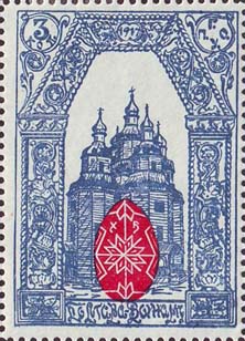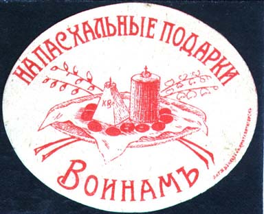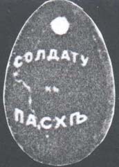1915 г. Виньетка в виде пасхального яйца разм. 27 х 41 мм. Одноцветная печать на белой глянцевой бумаге. Текст две строки: «Солдату к Пасхе». Сверху пробито отверстие для крепления.