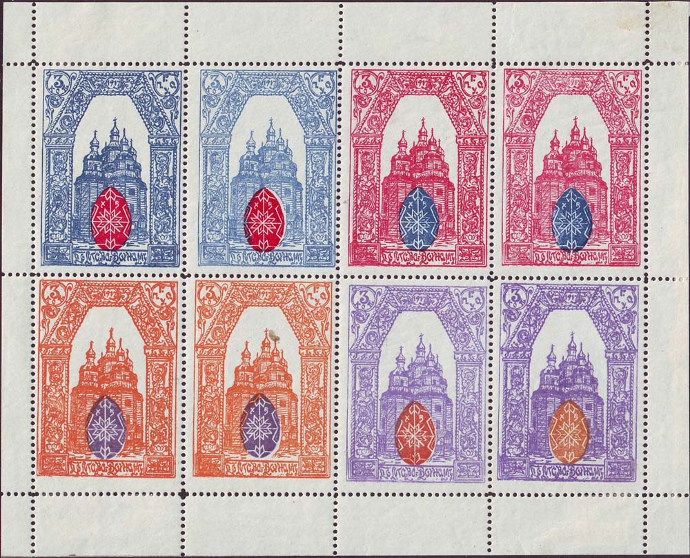 1916 г. Разм. рамки 34 х 49 мм. Двухцветная печать на белой бумаге. С клеем. Зубц. 11 1/2. Различные сюжеты. Текст: «П.Г.О.У. 1916. Полтава – воинам».