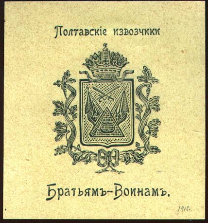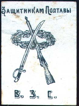 1916(?) г. Разм. 42 х 58 мм. Одноцветная печать на желтоватой бумаге. В центре скрещенные сабля, винтовка и венок. Сверху текст в одну строку: «Защитникам Полтавы». Внизу аббревиатура: «В.З.С.».