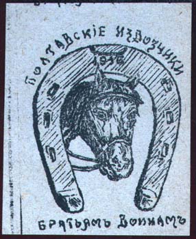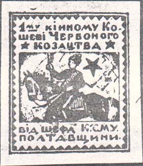1920(?) г. Разм. рамки 38,5 х 45 мм. Одноцветная печать на желтоватой бумаге. В центре всадник со знаменем. Сверху текст на украинском языке в три строки: «1-му конному полку Красного казачества». Внизу продолжение текста на украинском языке в две строки: «От шефа КСМУ Полтавщины».