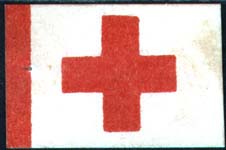 1915 г. Виньетка в виде щитка сложной формы разм. 42 х 55 мм. Двухцветная печать на белой бумаге. В центре в круглой рамке диаметром 26 мм красный крест. По периметру наружной рамки текст: «Вторая отечественная война. 1915 г. На противогазы».
