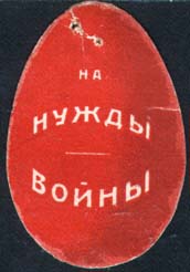 1915(?) г. Виньетка в виде пасхального яйца разм. 27 х 41 мм. Одноцветная печать на белой глянцевой бумаге. Текст три строки: «На нужды войны».