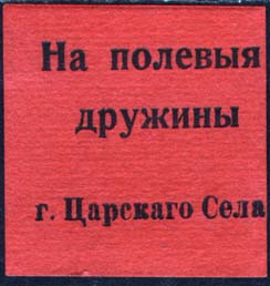 1915(?) г. Разм. ≈ 40 х 42 мм. Одноцветная печать на бумаге различных цветов и качества. Текст в три строки: «На полевые дружины г. Царского Села».