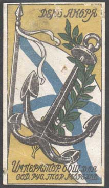 1916 г. 01.-03.03.1916 г. Разм. рамки 31 х 59 мм. Трехцветная печать на сероватой бумаге с мелованным верхним слоем. В центре военно-морской флаг России, якорь с четырьмя лапами и оливковая ветвь. Сверху текст: «День якоря». Внизу текст в две строки: «Император[ское]. Общ[ество]. для сод[ействия]. рус[скому]. тор[овому]. море-ход[ству].».