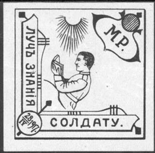 1917 г. 20.04.1917 г. Ромб разм. рамки 64 х 64 мм. Одноцветная пе-чать на белой мелованной бумаге. В центре солдат с книгой, сверху в декоративной рамке буквы: «М.Р.». Внизу в рамке текст: «Луч знания солдату» и дата в круглой рамке: «28.04.1917.».