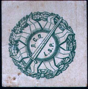 1917 г. Разм. 33 х 51 мм. Одноцветная печать на сероватой бумаге. В центре череп со скрещенными костями. Сверху полукругом текст: «Добровольческие революционные батальоны».