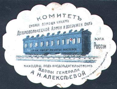 1919(?) г. Виньетка в форме овала с фигурными краями разм. ≈ 64 х 48 мм. Двухцветная печать на сероватой бумаге с мелованным верхним слоем. В центре служебный вагон на рельсах. На вагоне надпись: «Бани, питат[ельные]. пункты, мастерск[ие].». Сверху и справа текст в пять строк: «Комитет скорой помощи чинам Добро-вольческой Армии и вооружен[ым]. Силам юга России». Внизу продолжение текста в три строки: «Находящийся под председательством вдовы генерала А.Н.Алексеевой». Внизу справа мелким шрифтом выходные данные: «Акц. Общ. Печ. дела А.М.Гордон с С-м Р. Н/Д.».