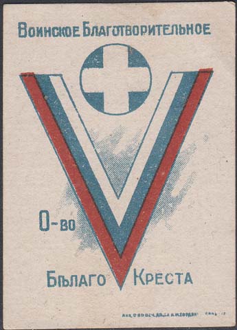 1919 г. Разм. 60 х 78 мм. Двухцветная печать на сероватой бумаге с мелованным верхним слоем. В центре нарукавный шеврон добровольческой армии. Сверху в круглой рамке диаметром 17 мм белый крест. Сверху текст: «Воинское Благо-творительное». Внизу продолжение текста в две строки: «О-во Белого Креста». Внизу справа мелким шрифтом выходные данные: «Акц. Общ. Печ. дела А.М.Гордон с С-м Р. Н/Д.».