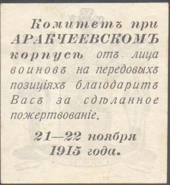 1915 г. 21.-22.11.1915 г. Разм. 59 х 64 мм. Одноцветная двухсторонняя печать на тонкой белой бумаге. На лицевой стороне герб графа Аракчеева. На оборотной стороне сверху текст в семь строк: «Комитет при Аракчеевском корпусе от лица воинов на передовых позициях благодарит Вас за сделанное пожертвование». Внизу дата в две строки: «21-22 ноября 1915 года».