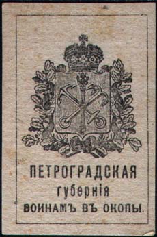 1914(?) г. Разм. рамки 32,5 х 52 мм. Одноцветная печать на толстой светло-серой бумаге. В центре герб Санкт-Петербургской (Петроградской) губернии. Внизу текст в три строки: «Петроградская губерния воинам в окопы».