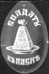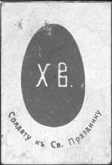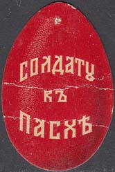 1915(?) г. Разм. 35 х 52 мм. Одноцветная печать на желтоватой бумаге с мелованным верхним слоем. В центре пасхальное яйцо и буквы: «Х.В.». Внизу полукругом текст: «Солдату к Св[етлому]. празднику».