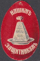 1915 г. 19.02.–14.03.1915 г. Виньетка в форме яйца разм. 42 х 27 мм. Двухцветная двухсторонняя печать на плотной белой бумаге с лаковым покрытием. В центре на тарелке пасха. Текст: «Нашим защитникам». На оборотной стороне выходные данные мелким шрифтом: «Лит. Киббель, П-ГР.».