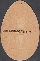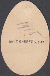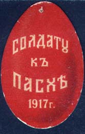 1915 г. 19.02.–14.03.1915 г. Виньетка в форме яйца разм. 42 х 27 мм. Двухцветная двухсторонняя печать на плотной белой бумаге с лаковым покрытием. В центре на тарелке пасха. Текст: «Солдату к пасхе». На оборотной стороне выходные данные мелким шрифтом: «Лит. Киббель, П-ГР.».