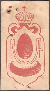 1915 г. 26.03.1915 г. Разм. 28 х 53 мм. Одноцветная печать на се-роватой бумаге. В фигурной рамке сверху корона и лента. В центре пасхальное яйцо и буквы: «К» и «А». Внизу полукругом текст: «Героям».
