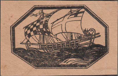 1915(?) г. Разм. 69 х 44 мм. Одноцветная печать на плотной сероватой бумаге. В двойной восьмиугольной рамке разм. 57 х 32 мм. Рисунок парусника в движении. Паруса в виде флагов.