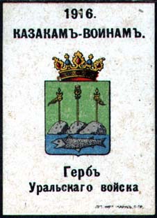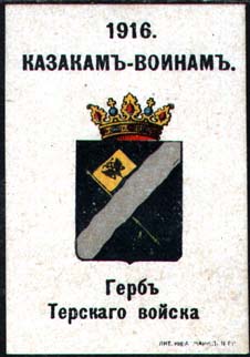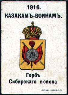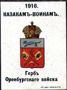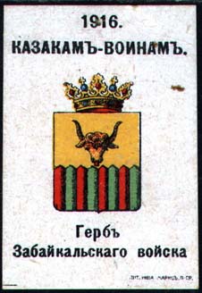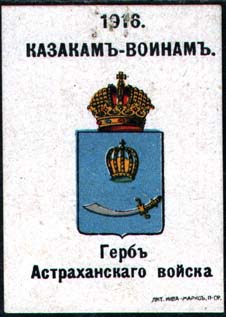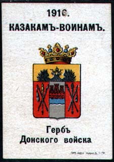 1916 г. Разм. ≈ 38 х 52 мм. Многоцветная печать на желтоватой бумаге с мелованным верхним слоем. В центре гербы казачьих войск. Сверху текст в две строки: «1916 казакам – воинам». Внизу под гербом пояснительный текст. Внизу справа мелким шрифтом выходные данные: «Лит. Нива–Маркс, П-ГР».