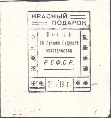 1919 г. 24.02.1919 г. Разм. 40 х 44 мм. Одноцветная печать на белой бумаге. Рисунок аналогичен предыдущему. Звезда с плугом и молотом в обрамлении венка. На ленте венка текст: «День красного офицера».