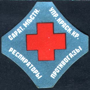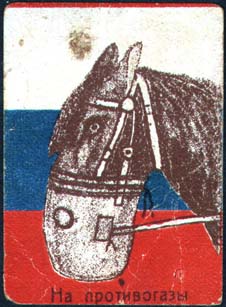 1915(?) г. Разм. 37 х 51 мм. Трехцветная печать на белой бумаге. В центре на фоне российского флага голова лошади в противогазной маске. Внизу текст в одну строку: «На противогазы».