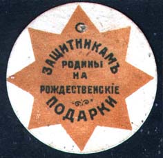 1915 г. 23.11.1915 г. Круг диаметром 37 мм. Двухцветная печать на белой бумаге. Восьмиконечная звезда, в центре которой текст в пять строк: «Защитникам Родины на рождественские подарки».