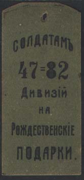 1915 г. 01.12.1915 г. Виньетка в виде погона разм. 26 х 58 мм. Двухцветная печать на желтоватой бумаге. Текст в шесть строк: «Солдатам 47-82 дивизий на Рождественские подарки».