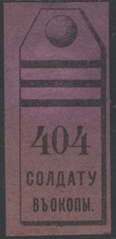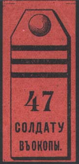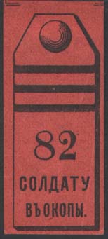 1915 г. 06.12.1915 г. Разм. 25 х 56 мм. Одноцветная печать на тонкой розовой бумаге. Погон с тремя поперечными лычками. Внизу цифры и текст в две строки: «Солдату в окопы».