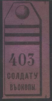 1915 г. 18.12.1915 г. Разм. 25 х 56 мм. Одноцветная печать на тонкой сине-серой бумаге. Погон с тремя поперечными лычками. Внизу цифры и текст в две строки: «Солдату в окопы».