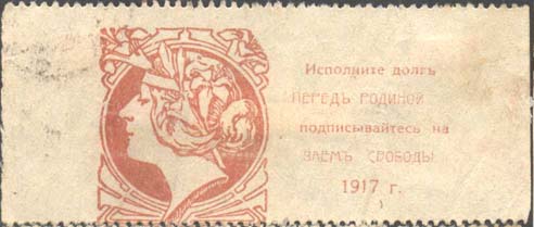 1917 г. Разм. ≈ 84 х 34 мм. Одноцветная печать на желтоватой бумаге. Горизонтальная зубц. 11 1/2. Слева в декоративной рамке голова женщины с лавровым венком. Справа текст в пять строк: «Исполните долг перед Родиной подписывайтесь на Заем Свободы 1917 г.».