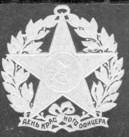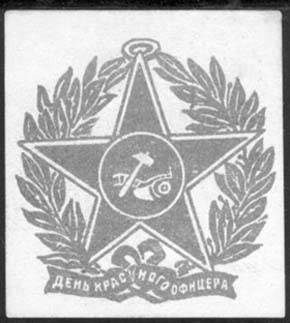 1918 г. 01.11.1918 г. Разм. 36 х 37 мм. Одноцветная печать на с тиснением на темно-розовой бумаге. Звезда с плугом и молотом в обрамлении венка. На ленте венка текст: «День красного офицера».