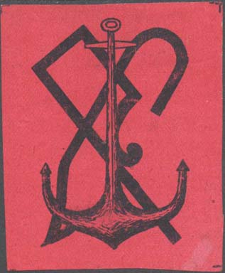 1917(?) г. Разм. 54 х 63 мм. Одноцветная печать на сероватой бумаге с фоном. В центре на розовом фоне якорь на фоне скрещенных букв «С» и «Р».