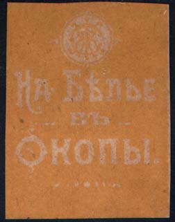 1915(?) г. Разм. ≈ 40 х 53 мм. Одноцветная печать на плотной желто-серой бумаге. Многоцветная печать на белой бумаге. Сверху в круглой рамке монограмма из букв «С.Ж.К.». Ниже текст в три строки: «На белье в окопы».