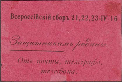 1916 г. 21-23.04.1916 г. Всероссийский сбор. Разм. 70 х 46 мм. Одноцветная печать на розовой бумаге. Сверху текст: «Всероссийский сбор 21,22,23-IV-16». Ниже текст в три строки: «Защитникам Родины От почты, телеграфа, телефона».