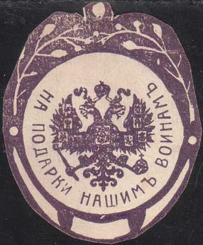 1915(?) г. Виньетка в виде щитка сложной формы разм. 48 х 57 мм. Одноцветная печать на белой бумаге. В декоративной рамке с растительным орнаментом в центре герб России. По окружности текст: «На подарки нашим воинам».