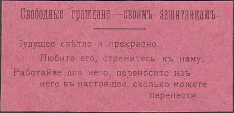 1917 г. Разм. 79 х 38 мм. Одноцветная печать на розово-сероватой бумаге. Сверху текст: «Свободные граждане – своим защитникам». Ниже горизонтальная черта. Внизу текст в пять строк: «Будущее светло и прекрасно. Любите его, стремитесь к нему, работайте для него, перенесите из него в настоящее, сколько можете перенести».
