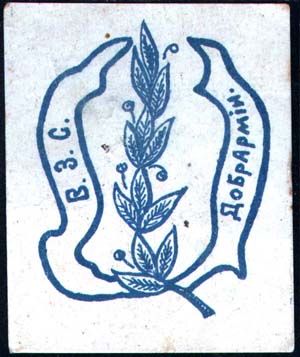 1919(?) г. Разм. 48 х 60 мм. Одноцветная печать на толстой гладкой белой бумаге. В центре лавровая ветвь и лента. На ленте текст: «В.З.С. Добрармии».
