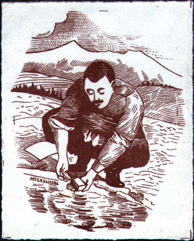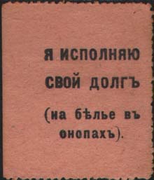 1919 г. Разм. 55 х 29 мм. Одноцветная печать на толстой розоватой бумаге. Зубц. 11 1/2 низ-кого качества. Текст в четыре строки: «Я исполнил свой долг (На белье в окопах)».