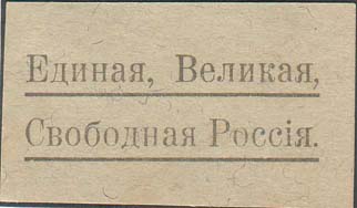 1919 г. Разм. 55 х 29 мм. Одноцветная печать на толстой бумаге различных цветов с вкраплениями волокон. Текст в две строки с подчеркиванием: «Единая, Великая, Свободная Россия».
