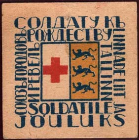 1916 г. Разм. 46 х 46 мм. Трехцветная печать на желто-ватой бумаге. В центре в рамке разм. 20 х 20 мм слева красный крест, справа герб г. Ревеля. По периметру текст на русском и эстонском языках: «Союз городов и Ревель солдату к Рождеству».