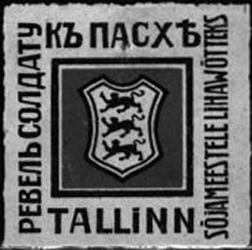 1916 г. Разм. 46 х 46 мм. Двухцветная печать на свет-ло-серой бумаге. В центре в рамке разм. 26 х 26 мм герб г. Ревеля. По периметру текст на русском и эстонском языках: «Ревель солдату к Пасхе».