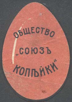 1915(?) г. Виньетка в форме яйца разм. 37 х 54 мм. Двухцветная печать на белой бумаге. Пасхальное яйцо с текстом в три строки: «Общество «Союз Копейки»».